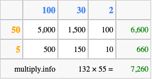 Below is an illustration showing you how to calculate 132 times 55 using the box method, using the instructions above.