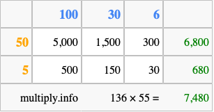 Below is an illustration showing you how to calculate 136 times 55 using the box method, using the instructions above.