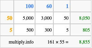 Below is an illustration showing you how to calculate 161 times 55 using the box method, using the instructions above.