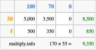 Below is an illustration showing you how to calculate 170 times 55 using the box method, using the instructions above.