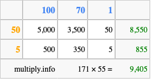 Below is an illustration showing you how to calculate 171 times 55 using the box method, using the instructions above.