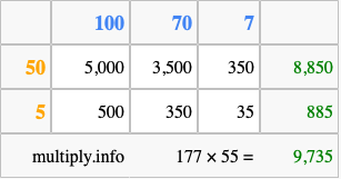 Below is an illustration showing you how to calculate 177 times 55 using the box method, using the instructions above.