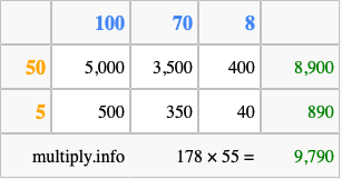 That's all there is to it! As you can see from the box above, the answer to 178 times 55 using the box method is 9,790.