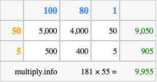 Below is an illustration showing you how to calculate 181 times 55 using the box method, using the instructions above.