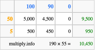 Below is an illustration showing you how to calculate 190 times 55 using the box method, using the instructions above.