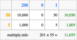 Finally, we add up all the sums we found in step 3 to get our final answer to 201 times 55.