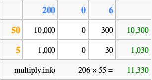Finally, we add up all the sums we found in step 3 to get our final answer to 206 times 55.