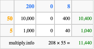 That's all there is to it! As you can see from the box above, the answer to 208 times 55 using the box method is 11,440.