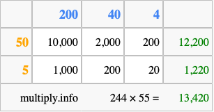 That's all there is to it! As you can see from the box above, the answer to 244 times 55 using the box method is 13,420.