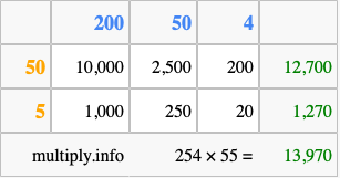 That's all there is to it! As you can see from the box above, the answer to 254 times 55 using the box method is 13,970.