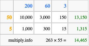 That's all there is to it! As you can see from the box above, the answer to 263 times 55 using the box method is 14,465.