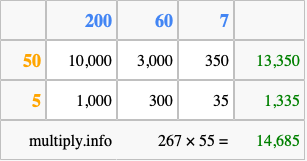 Below is an illustration showing you how to calculate 267 times 55 using the box method, using the instructions above.