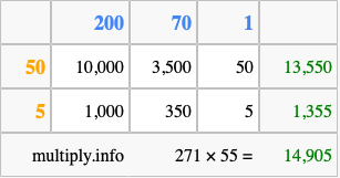 That's all there is to it! As you can see from the box above, the answer to 271 times 55 using the box method is 14,905.