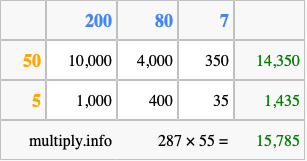 Below is an illustration showing you how to calculate 287 times 55 using the box method, using the instructions above.