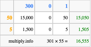 Finally, we add up all the sums we found in step 3 to get our final answer to 301 times 55.