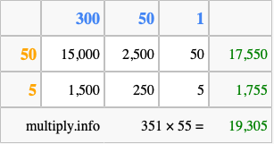 That's all there is to it! As you can see from the box above, the answer to 351 times 55 using the box method is 19,305.