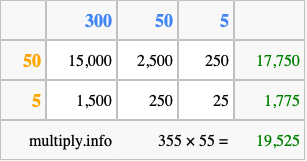 Below is an illustration showing you how to calculate 355 times 55 using the box method, using the instructions above.