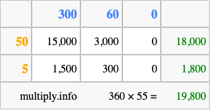 That's all there is to it! As you can see from the box above, the answer to 360 times 55 using the box method is 19,800.