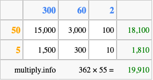 Finally, we add up all the sums we found in step 3 to get our final answer to 362 times 55.