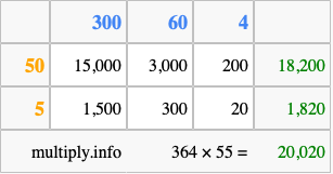 Finally, we add up all the sums we found in step 3 to get our final answer to 364 times 55.