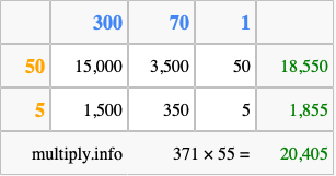 Below is an illustration showing you how to calculate 371 times 55 using the box method, using the instructions above.