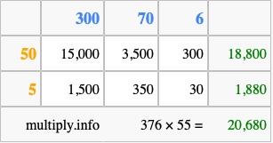 Below is an illustration showing you how to calculate 376 times 55 using the box method, using the instructions above.