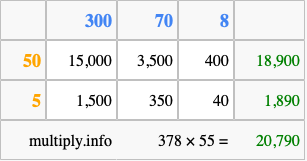That's all there is to it! As you can see from the box above, the answer to 378 times 55 using the box method is 20,790.