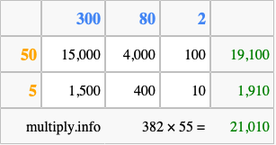 That's all there is to it! As you can see from the box above, the answer to 382 times 55 using the box method is 21,010.