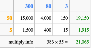 That's all there is to it! As you can see from the box above, the answer to 383 times 55 using the box method is 21,065.