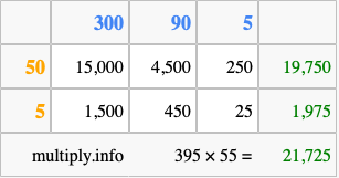 Finally, we add up all the sums we found in step 3 to get our final answer to 395 times 55.