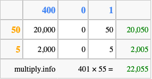 That's all there is to it! As you can see from the box above, the answer to 401 times 55 using the box method is 22,055.