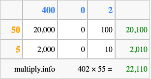That's all there is to it! As you can see from the box above, the answer to 402 times 55 using the box method is 22,110.