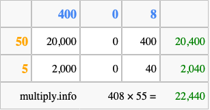 That's all there is to it! As you can see from the box above, the answer to 408 times 55 using the box method is 22,440.