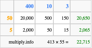 That's all there is to it! As you can see from the box above, the answer to 413 times 55 using the box method is 22,715.