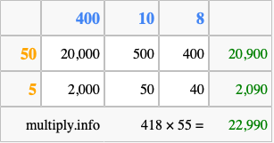 Below is an illustration showing you how to calculate 418 times 55 using the box method, using the instructions above.