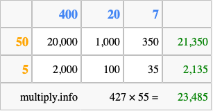 Finally, we add up all the sums we found in step 3 to get our final answer to 427 times 55.