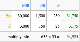 That's all there is to it! As you can see from the box above, the answer to 635 times 55 using the box method is 34,925.