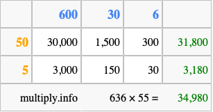 Below is an illustration showing you how to calculate 636 times 55 using the box method, using the instructions above.