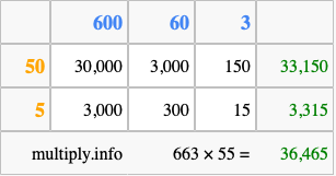 That's all there is to it! As you can see from the box above, the answer to 663 times 55 using the box method is 36,465.