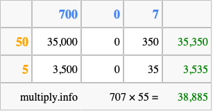 That's all there is to it! As you can see from the box above, the answer to 707 times 55 using the box method is 38,885.