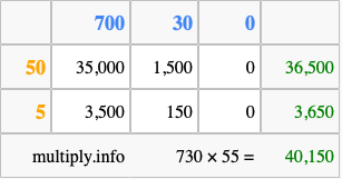 That's all there is to it! As you can see from the box above, the answer to 730 times 55 using the box method is 40,150.