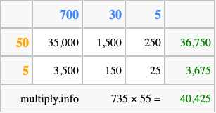 That's all there is to it! As you can see from the box above, the answer to 735 times 55 using the box method is 40,425.