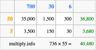Below is an illustration showing you how to calculate 736 times 55 using the box method, using the instructions above.