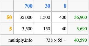 That's all there is to it! As you can see from the box above, the answer to 738 times 55 using the box method is 40,590.