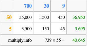 Below is an illustration showing you how to calculate 739 times 55 using the box method, using the instructions above.