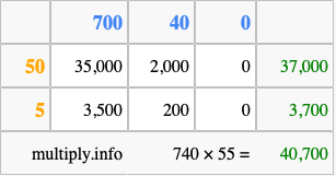That's all there is to it! As you can see from the box above, the answer to 740 times 55 using the box method is 40,700.