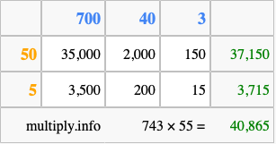 That's all there is to it! As you can see from the box above, the answer to 743 times 55 using the box method is 40,865.