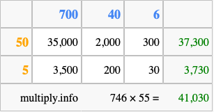 Below is an illustration showing you how to calculate 746 times 55 using the box method, using the instructions above.
