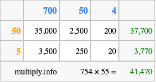 Below is an illustration showing you how to calculate 754 times 55 using the box method, using the instructions above.