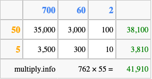 That's all there is to it! As you can see from the box above, the answer to 762 times 55 using the box method is 41,910.